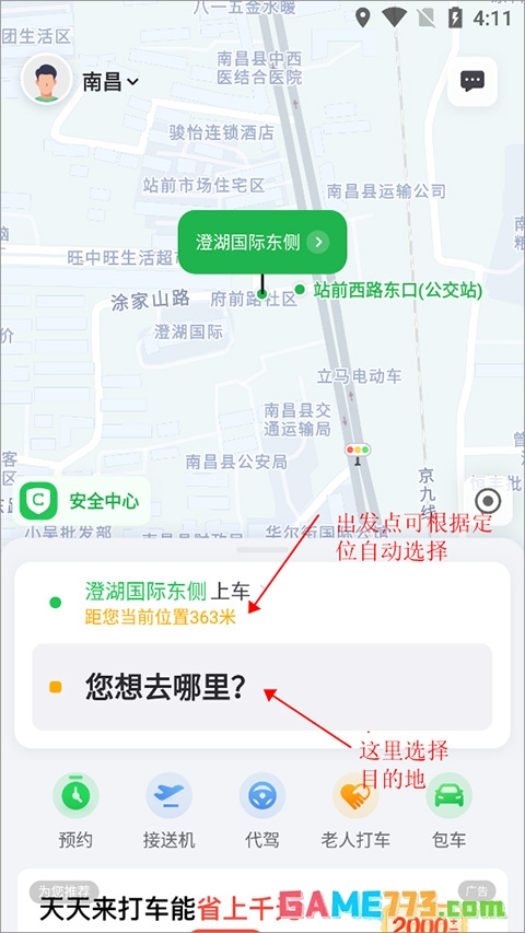 1、用户打开并登录软件后,进入页面选择出发地点(一般会根据用户的手机定位进行自动选择)和目的地