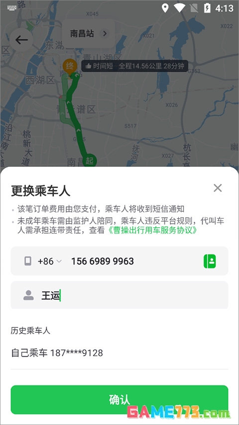 3、如果是帮别人叫车需要点击【更换乘车人】,在底部弹出的更换乘车人面板中输入别人的电话和姓名