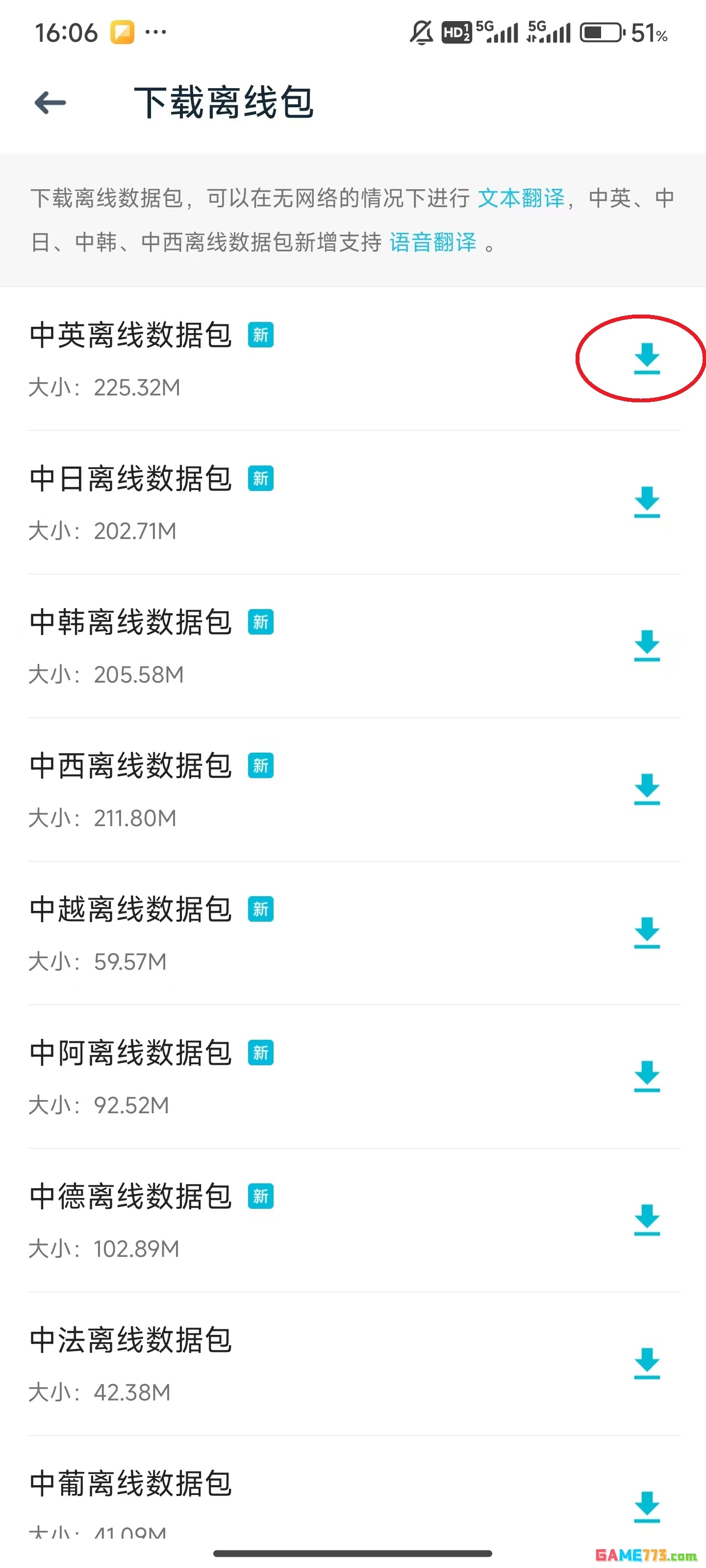 3、选择自己需要的离线翻译包,以中英离线数据包为例,点击其右侧的“下载”标识。