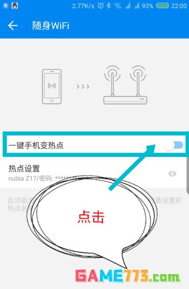 2、点击手机图标后,打开随身WiFi的界面,点击下面的一键手机变热点选项。
