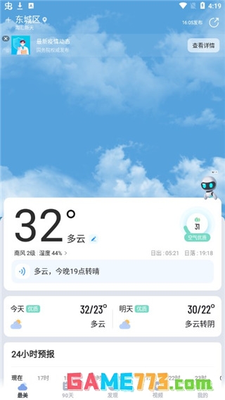 1、首先在本站下载最美天气,然后打开进入主页,这里可以查看你所在位置天气,小时更新播报天气,自动更新;
