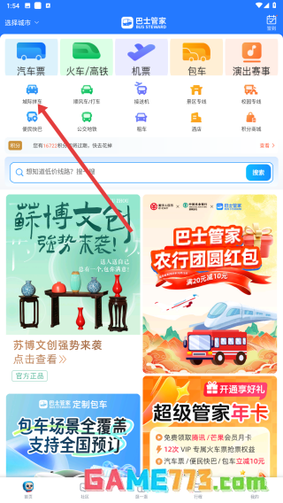 1、打开巴士管家APP,在首页点击城际拼车选项,进入跨城出行专属定制页面,开启跨城出行规划。