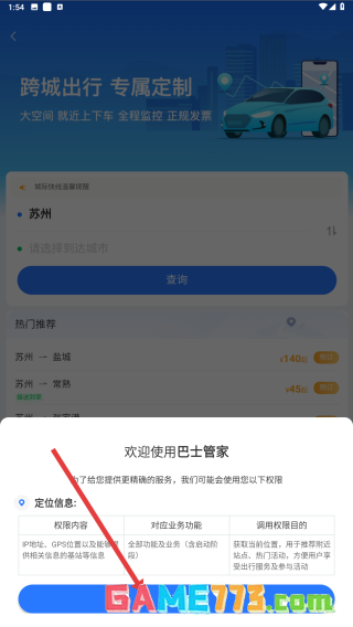 2、跨城出行页面,会弹出定位权限提示框,点击知道了,确认权限使用,以便获取更精准的服务。