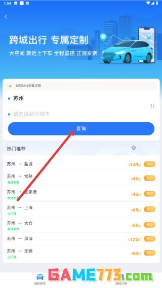 3、确认权限后,在跨城出行页面选择出发地和到达城市,然后点击查询按钮,查找相关的跨城出行班次。
