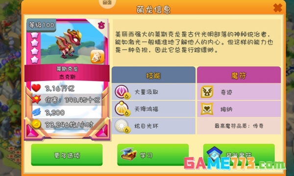 3、如果装备再好一点,比如主力爱情龙40级,秋季龙35级其它30级或30级以下,打法是爱情龙和随便两只等级随意的炮灰一组,群秒,35级秋季龙和30级气球龙和30级彗星龙一组,上毒也是都能秒对面单体,除了秋季龙,爱情龙满技能和技能等级,其它龙技能基本2到3级,属性随意,主要是等级差拉开都好打,地下城其实不难,掌握了诀窍,就可以很简单通过啦。小伙伴们赶紧攒食物升级吧~不够食物的话,该卖的卖买该的买该合成的赶紧合成。