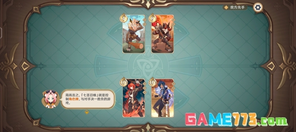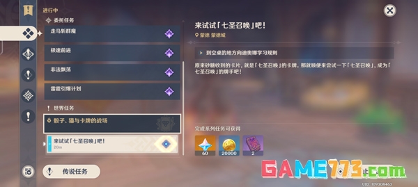 1、打开原神2025最新版,要想游玩原神七圣召唤,首先需完成前置任务“骰子、猫与卡牌的战场”;