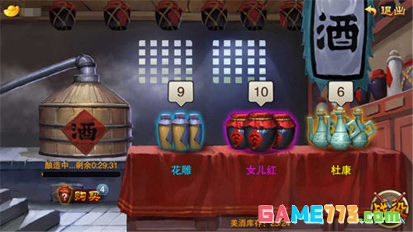 “葡萄美酒夜光杯”,酿造“美酒”是《三国之刃》的又一大乐趣。系统开启后,您就相当于拥有了个“高级挂机机器人”,高效率挂机,十秒内完成,是您居家旅行的必备之物!另外,酒窖的最大库存是18瓶,当系统提醒您“酒窖已酿满美酒”的时候,请务必上游戏把美酒用光,这样就能继续酿造了,您也就因此而拥有源源不断地美酒啦!
