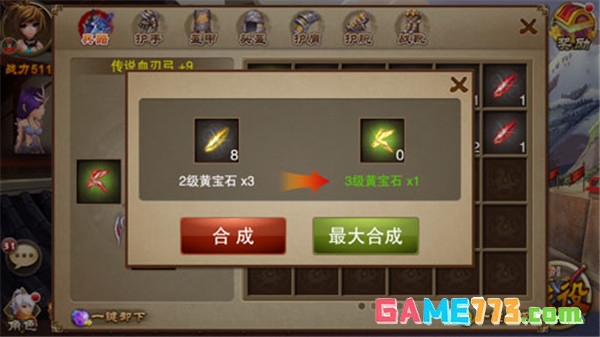 待强化装备系统开启后,只要身上有强化所需的材料,那就必须要强化到最高等级,而后进阶,再强化到最高等级——这将帮助您把战力最大化。等到宝石系统开启之后,请务必尽可能地将身上的宝石合成到最高等级,镶嵌到全身的装备上。强化进阶和宝石镶嵌,对提升战力的作用可是非常巨大的哦。