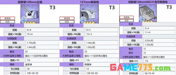 双联120强力通常弹;127单装炮过渡用高爆炮;紫SKC41过渡用***。