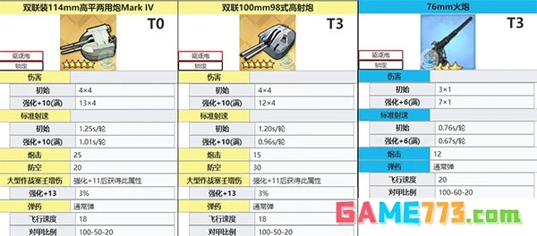 76火炮(右一),通常弹,射速最快的主炮,几乎没有炮击输出,用于主炮占比非常少的驱逐舰。