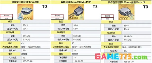 三联203markIX(右一),最强高爆弹之一,装备研发制造,dps高于阿尔及利亚炮,低于路易炮。射速较慢。