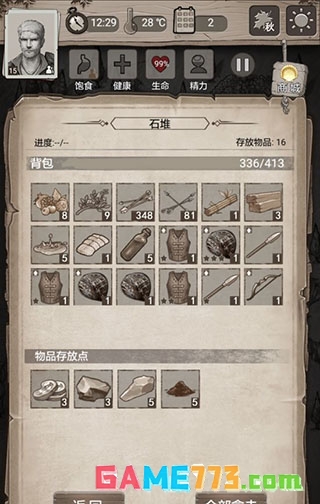 打完废墟回家迁营。然后依次打石堆(石块石片生肉循环资源点)和灌木丛(浆果草药亚麻循环资源点)。矿洞请带上四把镐子
