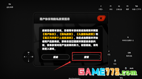 1、阅读用户协议后,点击红框标注的接受按钮进入游戏。