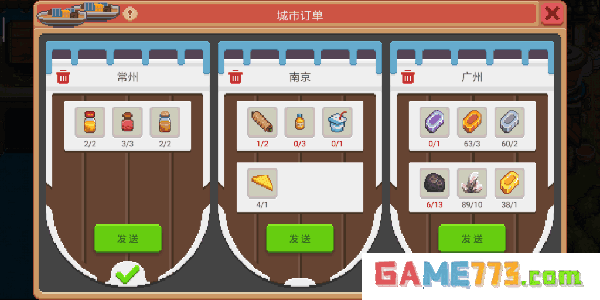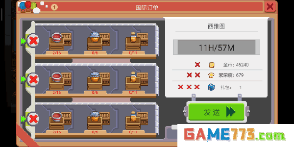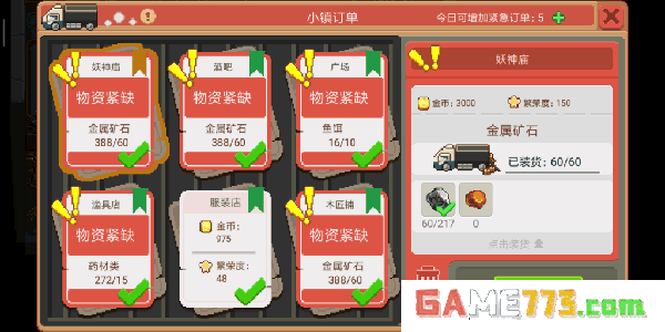 普通订单的货物是固定的,收集齐物品发送订单后,就完成订单获得固定的金币和繁荣度。