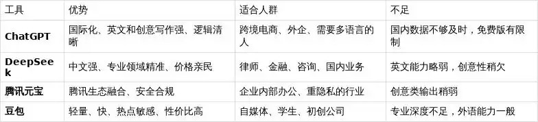 豆包和腾讯元宝哪个好用?面对功能各异的AI工具,精准选择的关键在于明确自身需求。ChatGPT在国际化业务交流和英文内容创作方面表现卓越;DeepSeek则在中文理解与专业领域分析上展现独特优势;腾讯元宝凭借与办公场景的深度整合,让工作流程无缝衔接;而豆包以其轻量化特性,特别适合社交媒体内容的快速生成。必须认识到,没有适用于所有场景的万能AI,唯有根据具体使用需求选择最匹配的工具,才能真正实现工作效率的成倍提升。你有没有这种感觉:最近想用个AI帮忙写东西、做表格、查资料,结果一搜出来一大堆——ChatGPT、DeepSeek、腾讯元宝、豆包……名字听着都挺高大上,但到底哪个更好用?哪个更适合自己?一时间真有点“选择困难症”了。