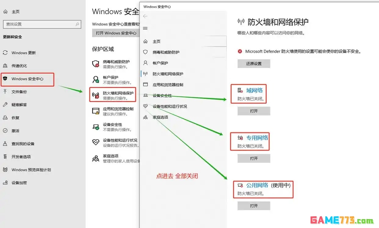 关闭防火墙,windows安全中心 – 防火墙和网络保护 – 域网络、专用网络、公用网络-分别点击去关闭
