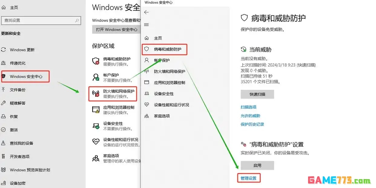 windows安全中心 – 防火墙和网络保护 – 病毒和威胁防护 – 管理设置