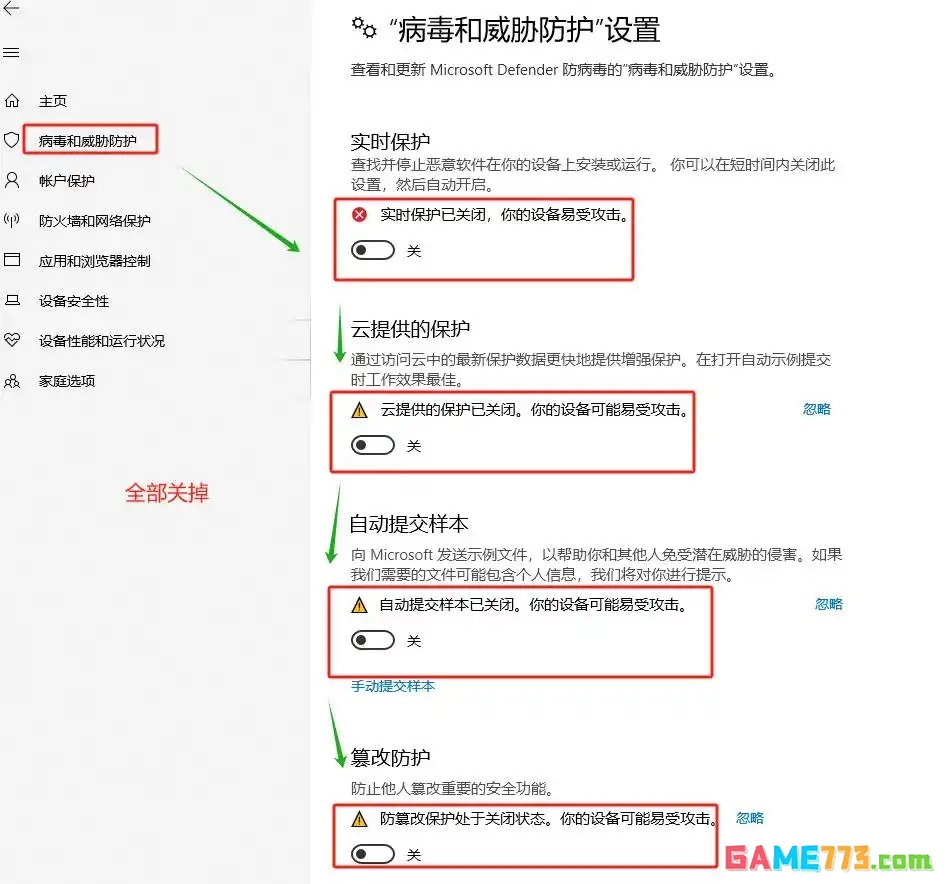 实时保护、云提供的保护、自动提交样本、篡改防护 – 全部