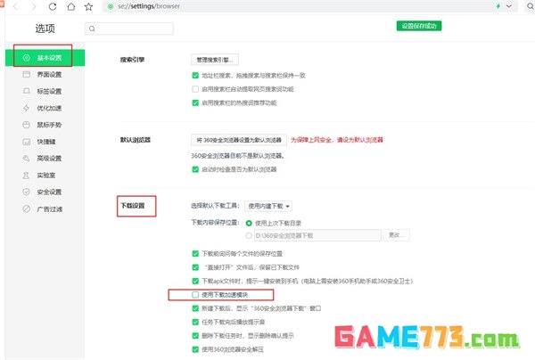 4、在选项中找到【基本设置】板块,之后在【下载设置】板块当中,将”使用下载加速模板“勾选去除。