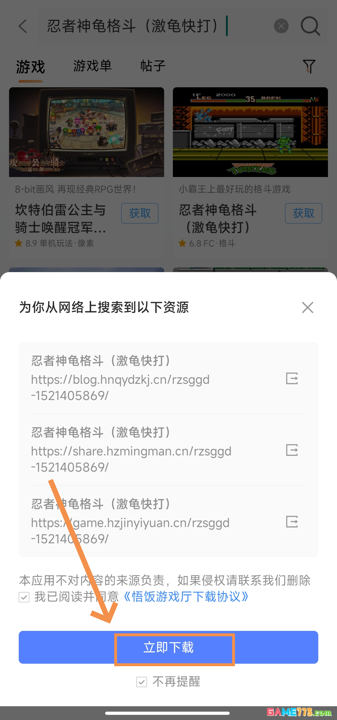2、进入该软件后可以搜索自己喜爱的游戏并下载,悟饭游戏厅整合了超多游戏资源,小鸠这里下载的是不少小伙伴心中的经典之作:忍者神龟格斗