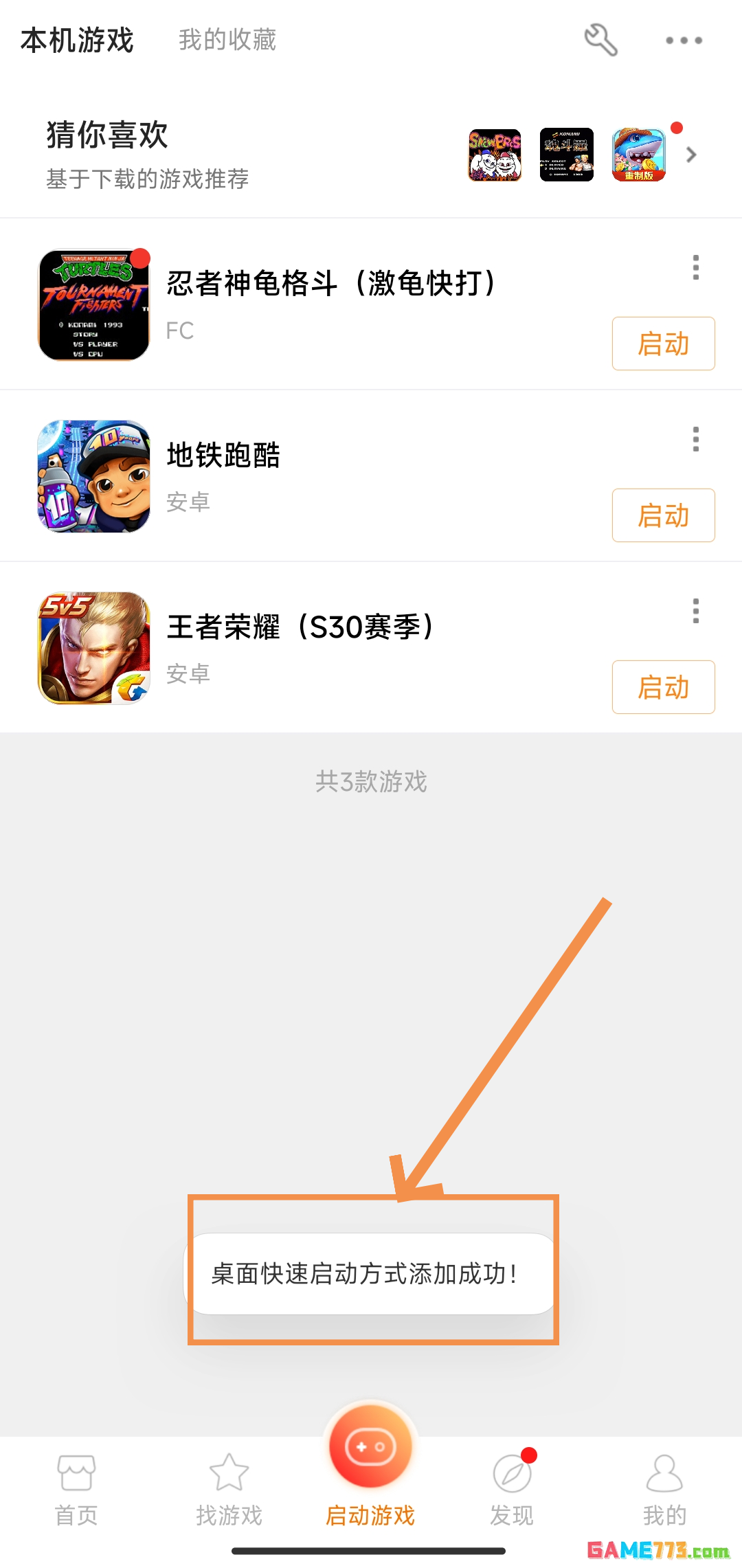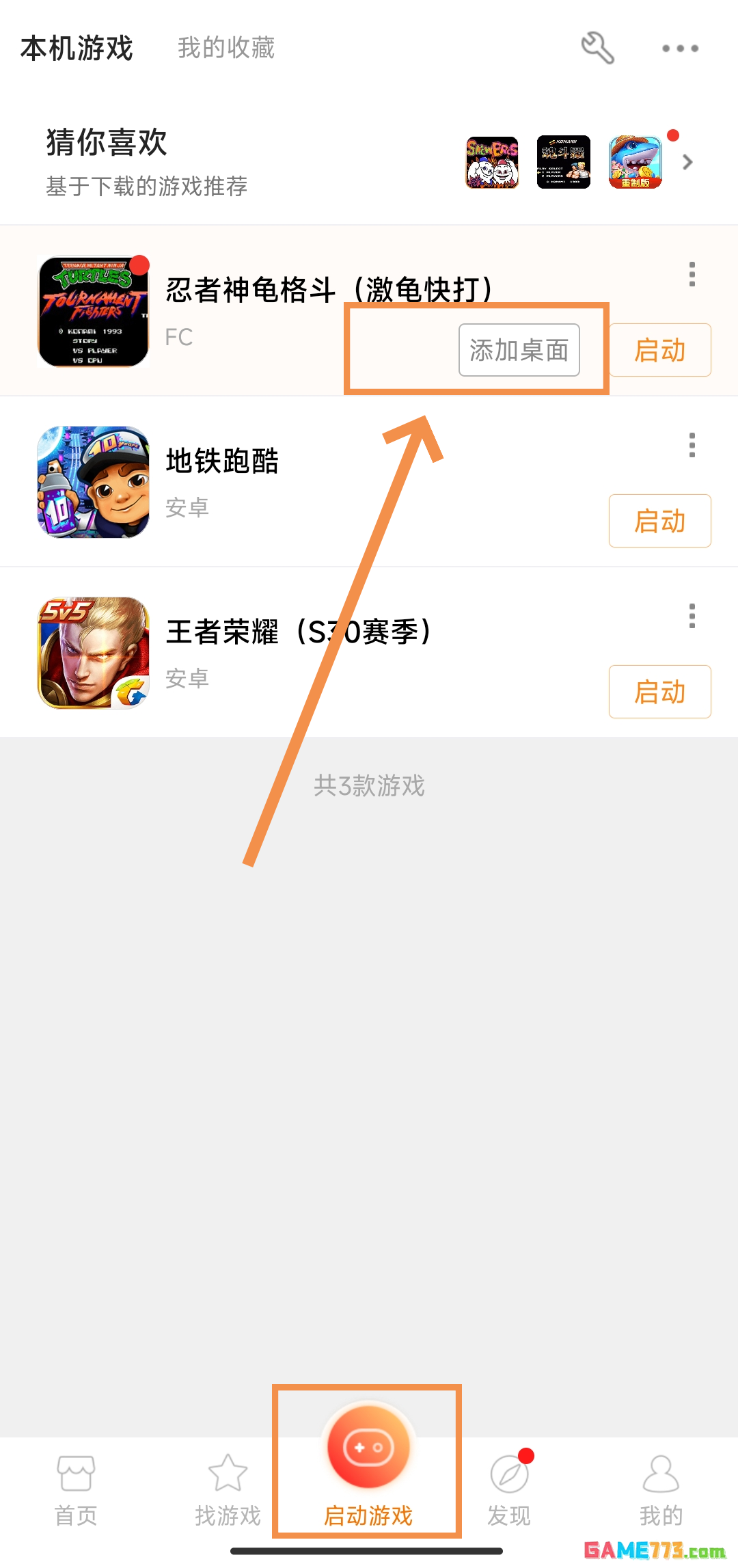 4、如图所示在启动游戏界面可以看到本机已安装的所有游戏,找到刚刚下载的忍者神龟格斗,并点击添加桌面