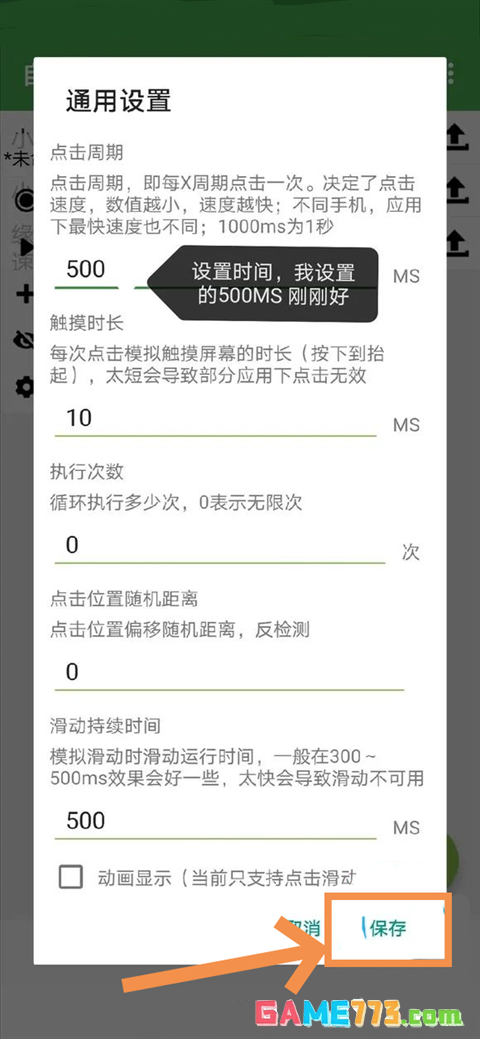 11、选择第一个点击周期设置每次点击中间间隔时间,这个时间单位是毫秒,一秒等于1000毫秒,这里需要设置成500毫秒,就是半秒钟,时间太长太短都不行,500我设置时间对我的正好,每个人手机灵敏度不一样,你们也可以根据自己手机的反应速度来设置时间,多试几次找到适合自己的就行,点击位置随机偏移建议设置20防检测,设置完成后点击右下角保存。
