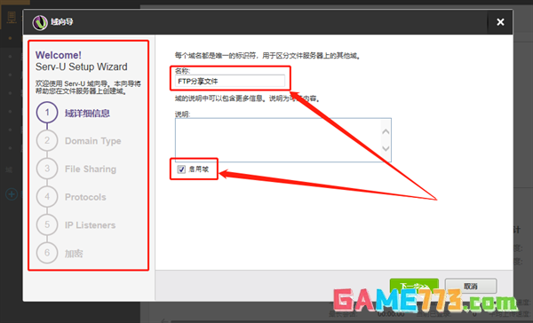 首先Serv-U会要求我们对自定义域的名称进行设置,这里填入我们喜欢的名字即可