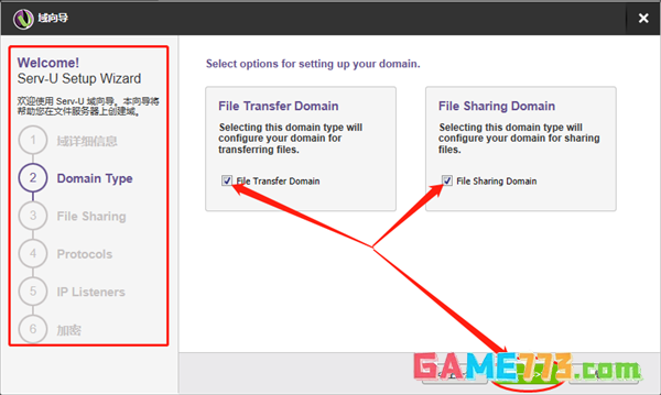 第三步Serv-U会要求我们填入domain URL(域名网址),这里我们根据其范例填入本地地址即可(127.0.0.1);第二行是file sharing repository(共享文件存储库),小鸠选择整个E盘均进行共享。如果需要设置为共享某个文件夹的,则可以点击栏位右侧的“文件夹”图标进行选择