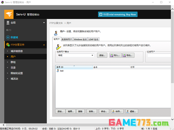完成以上步骤后,我们就完成了Serv-U的共享区域设置,接下来就是添加域用户步骤。这里我们只要跟着软件提示进行操作即可。需要注意的是,在域用户设置的最后一步,会涉及该用户访问共享文件的权限,如果不想该用户修改共享文件,则要选择“只读访问”,反之则选择“完全访问”。