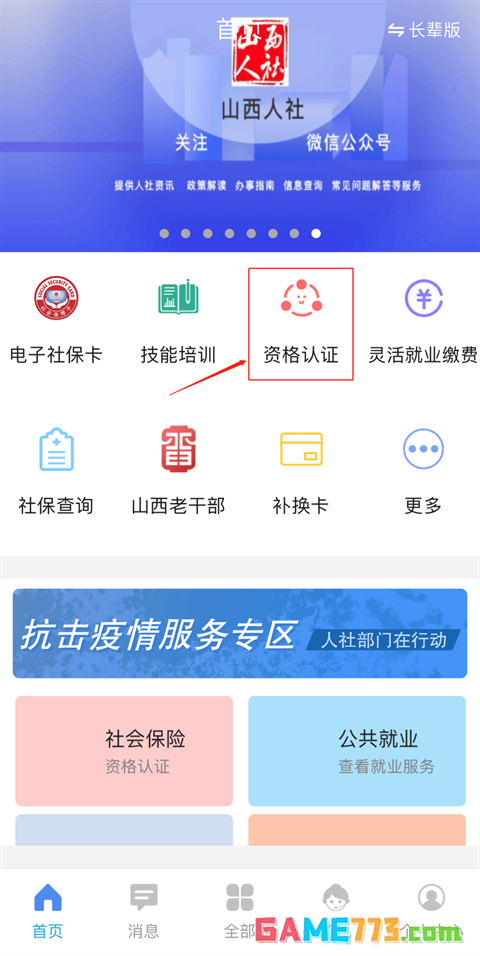 4、进行养老资格认证,返回“民生山西”的主页面,点击“社会保险”进入,或者左上方点击“资格认证”进入,点击“认证”,跳转至拍摄画面,按语音提示要求对准你的头正面脸部,进行【刷脸】认证(系统可自动识别),当显示“已通过”表示刷脸成功。(注:如果重复刷脸认证不成功,不要着急,多试几次)