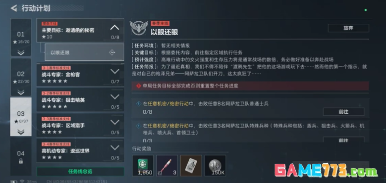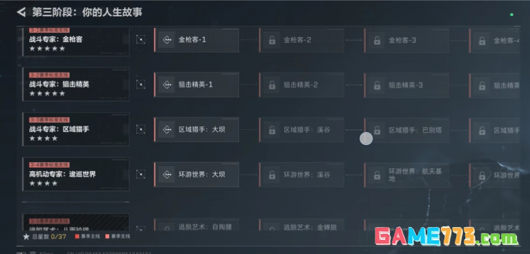 行动计划任务第三阶段的任务量巨大,需要24颗星星,第三阶段任务速通可以选择:主线任务+3-1金枪客、3-2狙击精英、3-3区域猎手;