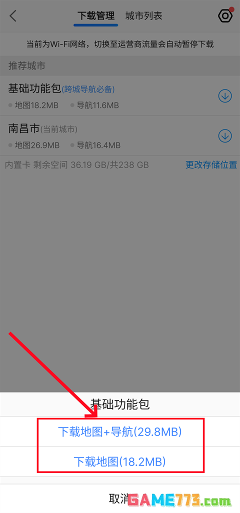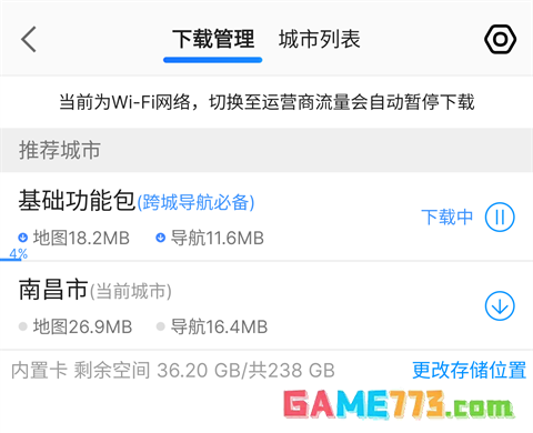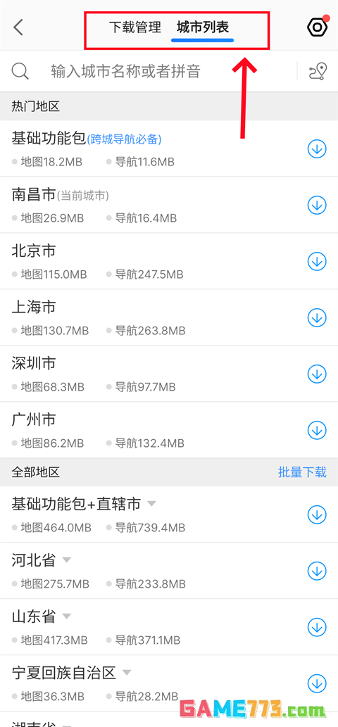 3、软件默认为当前定位城市的地图包,可以在城市列表中选择更换