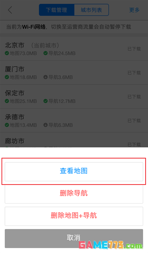 ①【我的】→【离线地图】→下载管理页面,点击想要查询地点的城市,点击【查看地图】进行城市切换