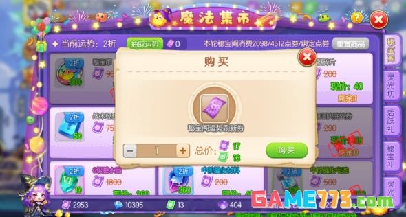 1、首先先说结论,魔法集市可以白嫖很多平时需要花钱购买的商品,比如凤凰枪,并且活动本身的性价比也很高。点开集市入口,右侧有5个板块,上面两个“秘宝阁”、“灵光坊”分别对应氪金、钻石消费,其中最重要的货币是“秘宝币”和“灵光币”。