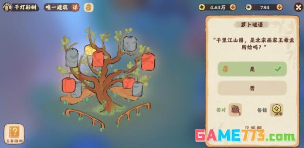 桃源深处有人家千灯彩树答案是什么?桃源深处有人家这个游戏很多小伙伴都在玩,并且最近还上线了一个活动玩法,那就是千灯彩树。千灯彩树萝卜谜语是一个比较休闲的玩法,玩家需要解答一系列与游戏相关的谜题,正确的答案将给玩家不错的奖励,这边已经给大家汇总了答案,赶紧看看吧。