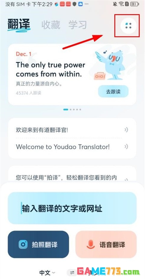1、首先打开有道翻译官app进入,点击右上角图标,如下图所示: