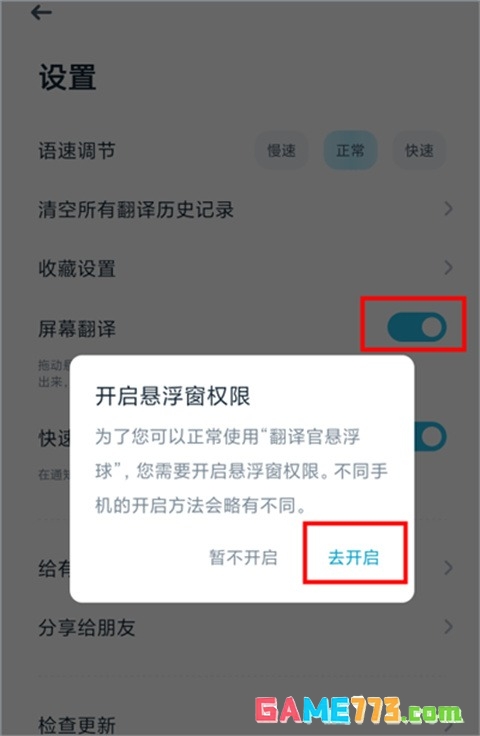 3、跳转自【设置】页面,点击【屏幕翻译】,让其功能开启,并【去开启】悬浮窗权限