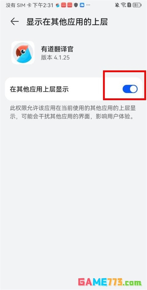 4、大家可根据自身手机设置来进行设置,如小编所示点击开启【允许显示在其他应用上方】的按钮即可