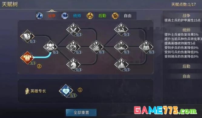 ③然后就不再点【战争】了,转到【统帅】界面,“治疗提升”、“伤兵转化”、“统帅提升”这三项只需要点亮即可,确保技能树的通畅;