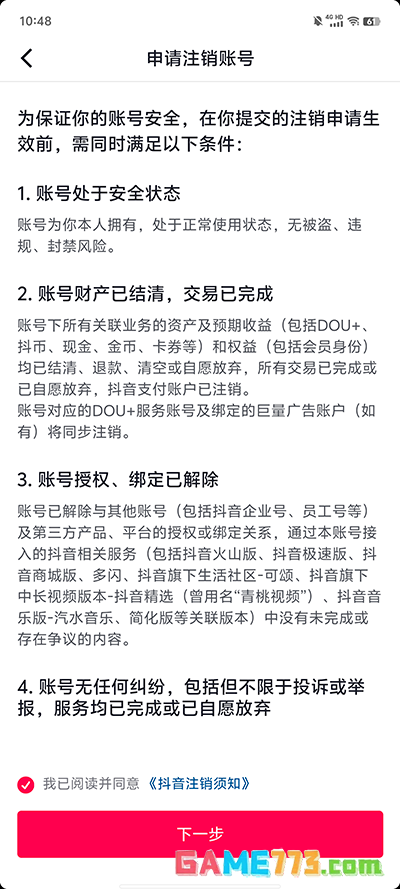 6、满足注销要求后(如账号安全、财产清空、解除其他登录或绑定关系、无纠纷投诉举报等),点击“下一步”。