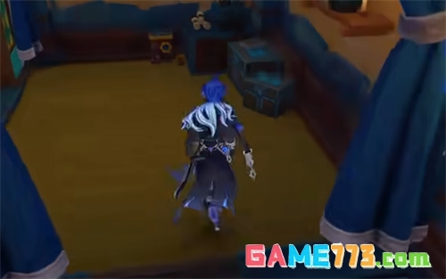 2、进入后沿着走廊前行,右侧角落可见堆放的木箱与宝藏堆。