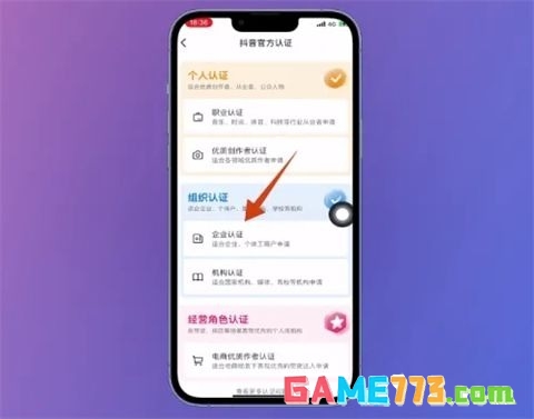 将抖音官方认证页面打开后,在组织认证里面选择【企业认证】。