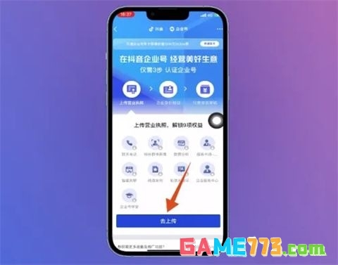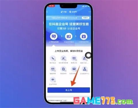 把企业认证页面打开后,点击页面下方位置的【去上传】。