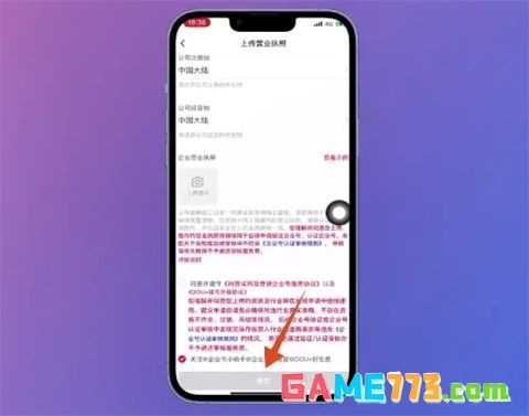 在资料上传页面中,按照提示【上传营业执照】,勾选同意服务协议,点击下方位置的【提交】按钮,按步骤进行申请抖音蓝v即可。