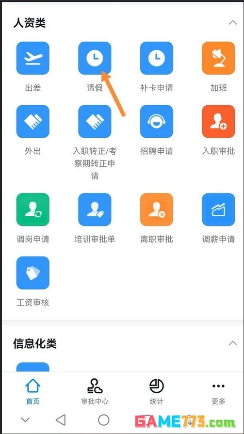 第二步:点击OA审批进入下一界面。上滑屏幕至人资类选项,如下图所示。