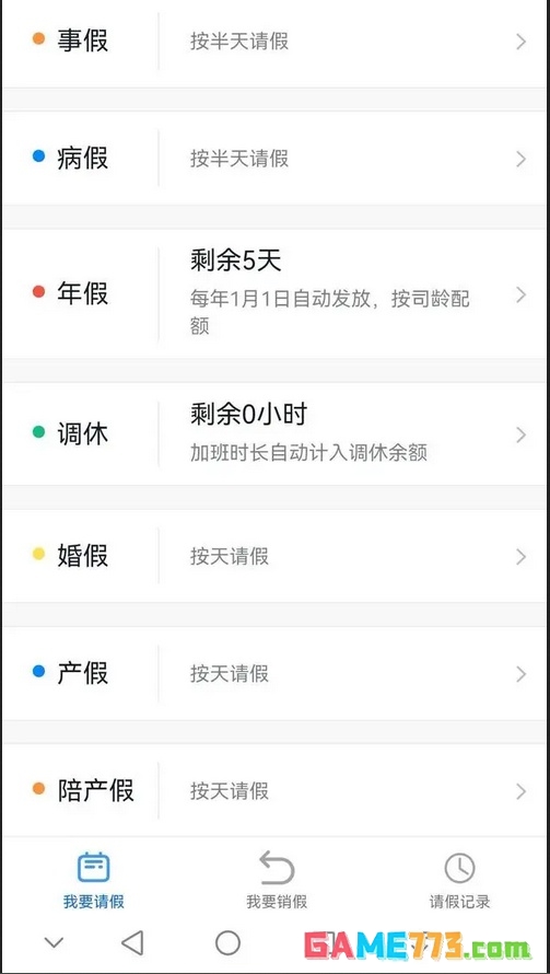 第三步:点击请假进入请假界面,如下图所示。有好几个请假的类型。我们根据自己的情况选择请假的类型。