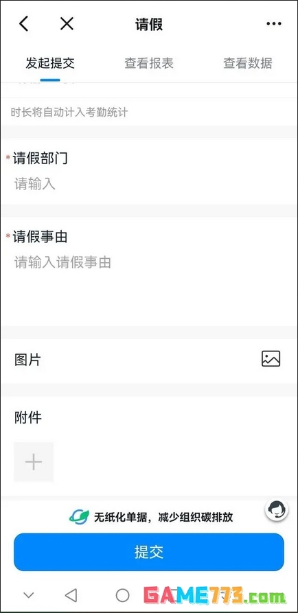 第四步:以事假为例:认真填写请假的开始日期和终止日期。自己所在的部门、请假事由、并上传相关的图片和附件。