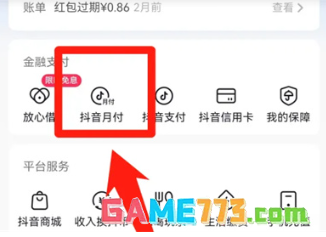 2. 来到抖音钱包页面后,在“金融支付”的下方找到“抖音月付”功能,并在上面点击进入。