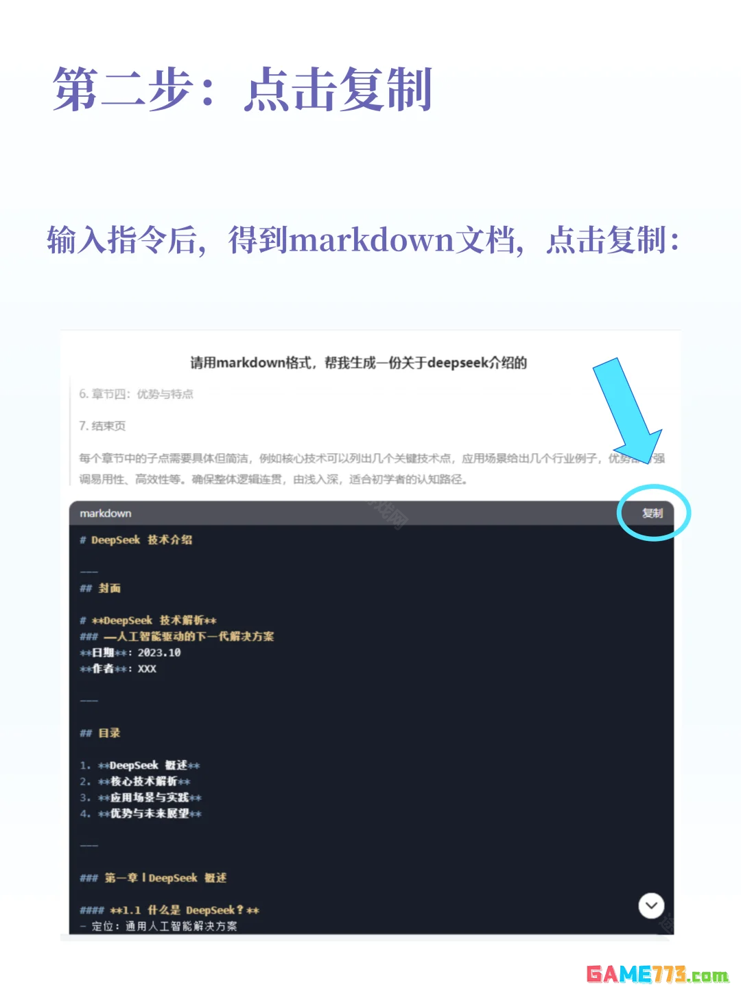 2、输入指令后等待deepseek运算,完成后我们会得到markdown文档,点击复制
