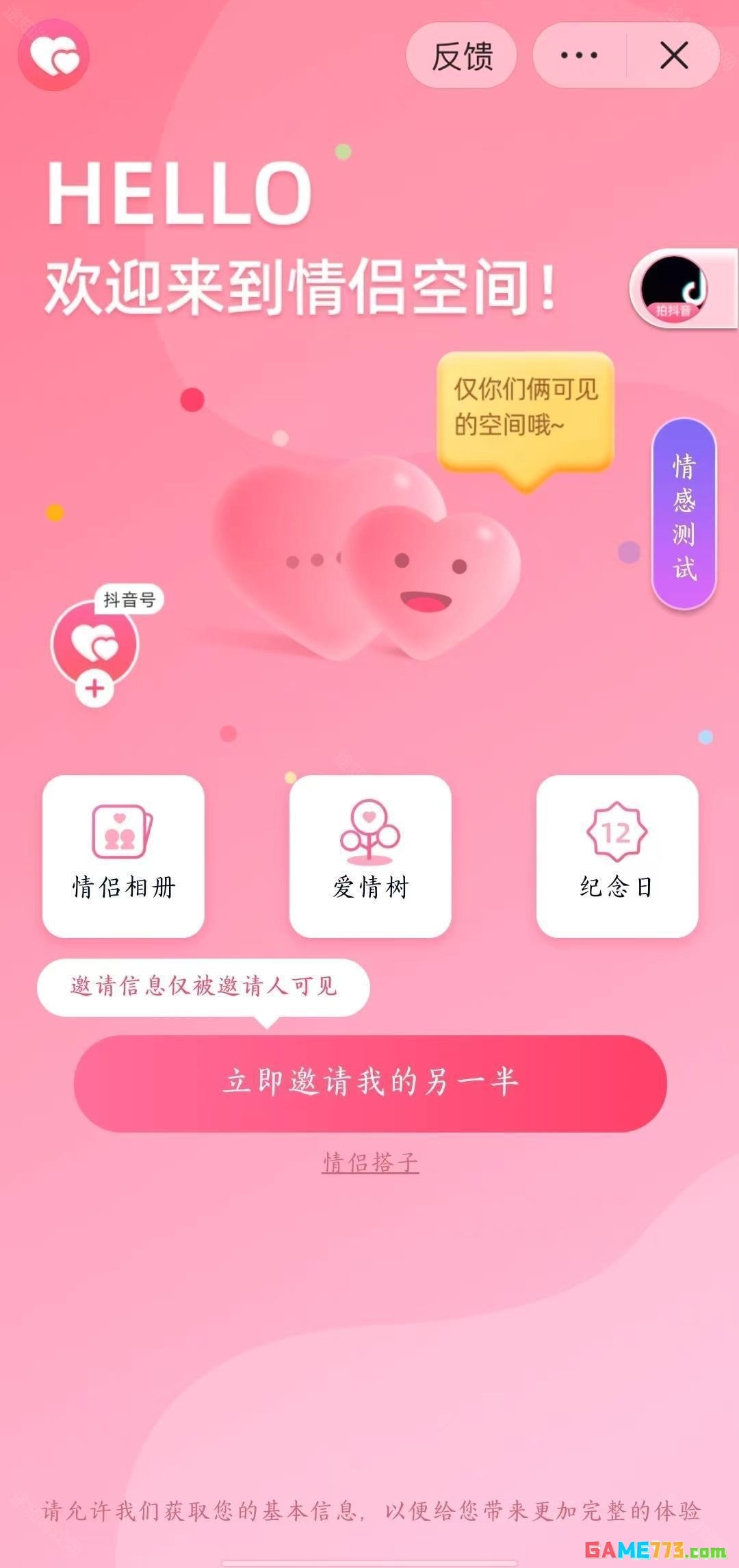 3、如果再次进入情侣空间功能,会提示让用户进行绑定。